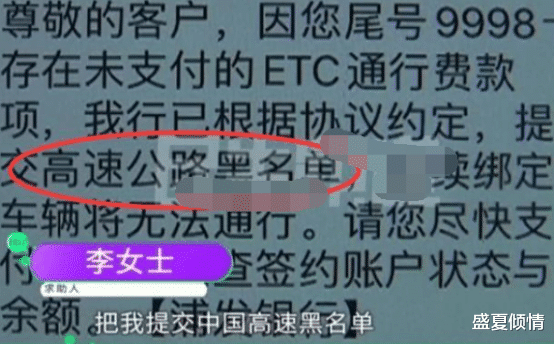 既然丈夫這么說了,李女士也就沒有多想,然后兩人就這樣開回家了。可之后幾天,李女士就受到了一條短信,短信顯示,李女士那天停車費用是3595元,因為李女士的余額不足,所以銀行先墊了。 看到這條短信的李女士,一時間懵了,根本不知道怎么回事。沒過多久,李女士手機又發(fā)過來一條短信,說是李女士又沒有支付的etc通行費,所以李女士被提交到高速路黑名單里了。