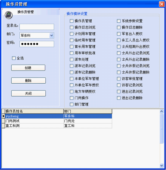 在該頁面下選擇可操作的權(quán)限,以及所屬部門,并輸入操作員名字和密碼點(diǎn)擊創(chuàng)建,則完成所有工作。