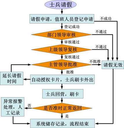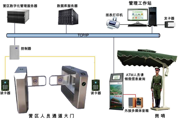 該系統射頻感應卡或人臉信息作為信息載體,充分利用已有資源,保護原有投資,增加相應識別設備、顯示設備和相應管理軟件,不改變現用的請銷假流程,完成士兵的請銷假管理。